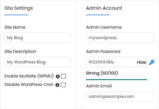 8. Under the Admin Account field, enter the following information: